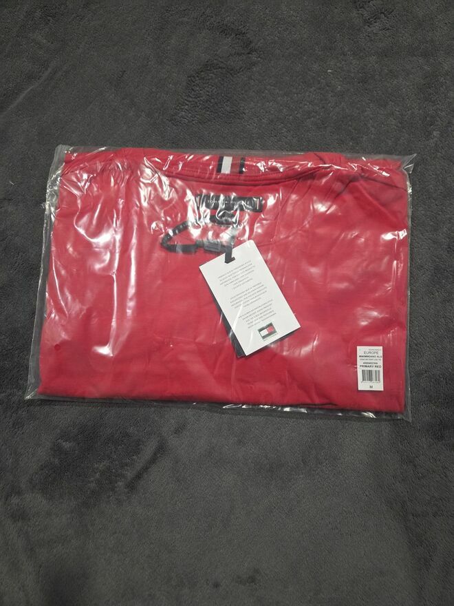 SprzedamMęska koszulka Tommy Hilfiger w kolorze czerwonym, rozmiar M/48, nowa. Otwarta do zdjecia.